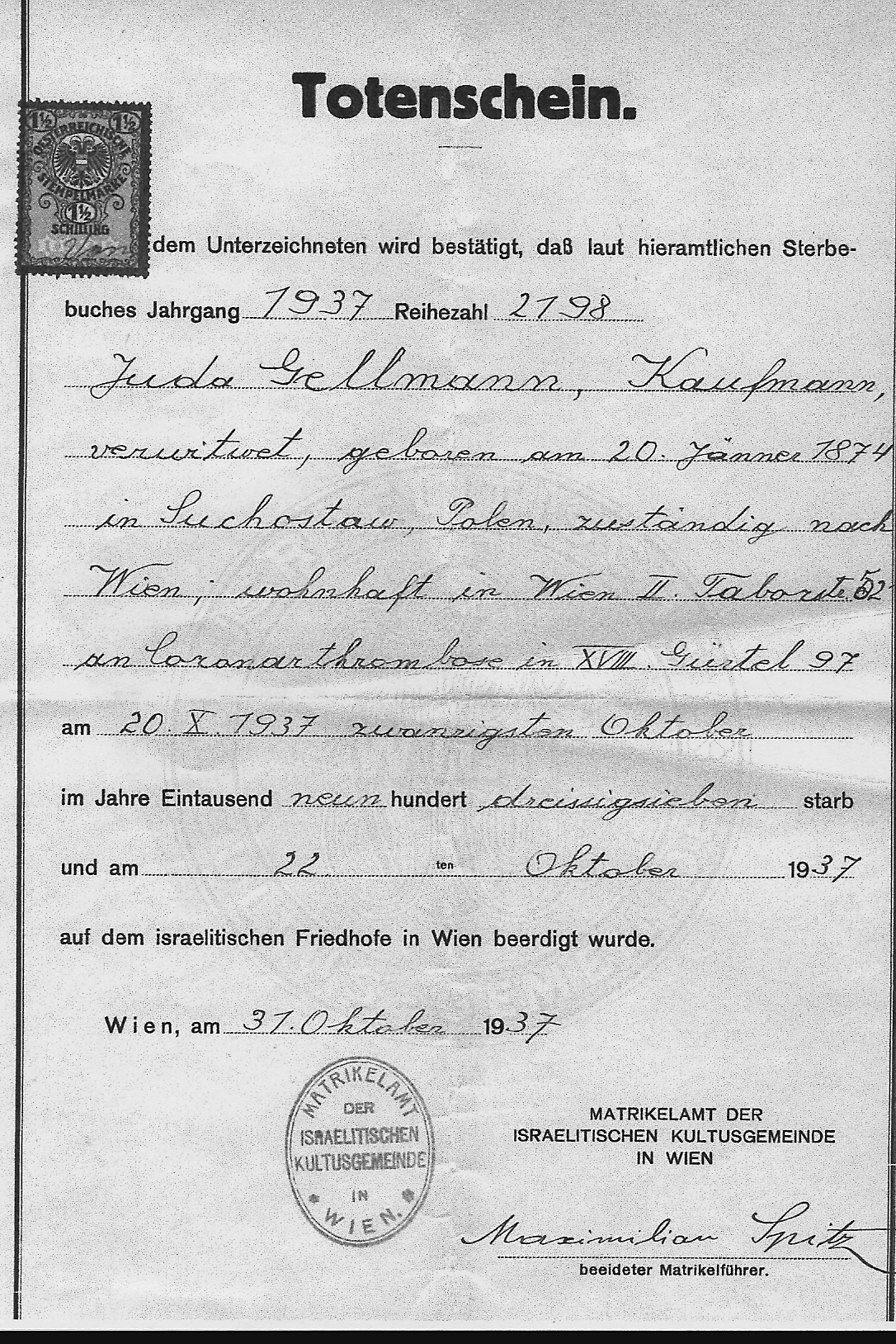Death Certificate for Juda Gellmann
