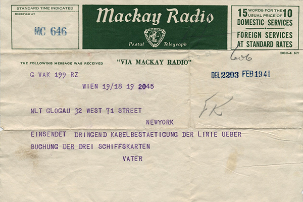 1941 Telegram from Lisbeth Glogau