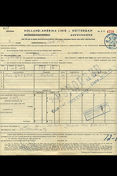 Lisbeth Glogau's passage document to USA from Rotterdam Dec 24 1939